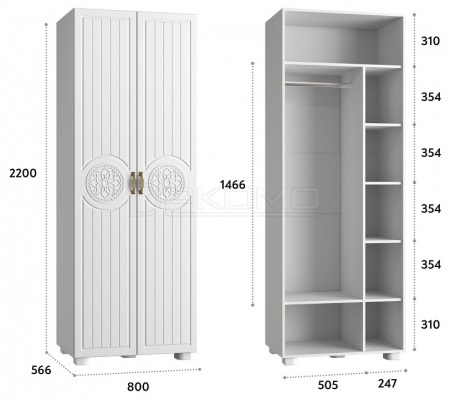 - 1 штанга для вешалок, 2 дверцы, 6 полок