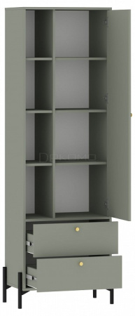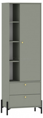 Шкаф комбинированный с открытыми и закрытыми полками и двумя выдвижными ящиками на шариковых направляющих полного выдвижения из серии Нуар. Дверца оборудована вкладными петлями с доводчиками. Изделие установлено на высокие металлические опоры.