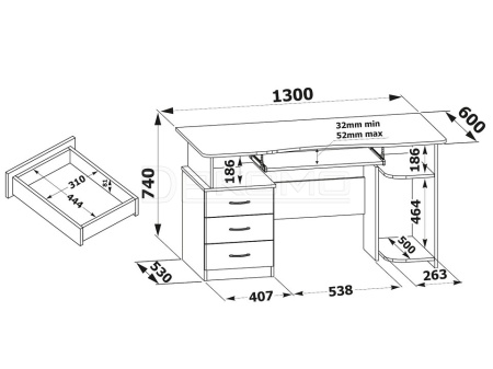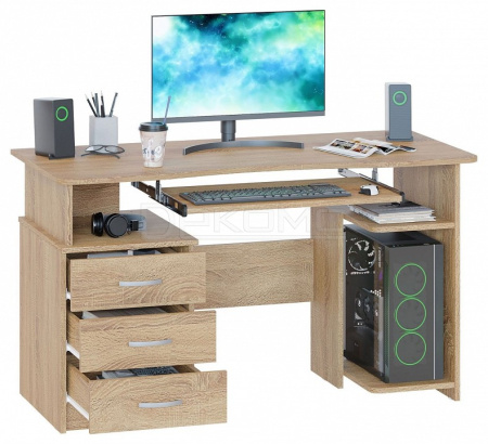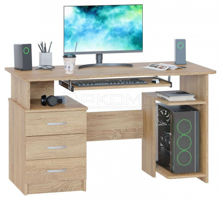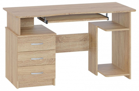 Удобный компьютерный стол. Столешница имеет анатомическую форму, она изготовлена из высококачественного ЛДСП отечественного производства толщиной 16 мм, отделана противоударной кромкой ПВХ. Стол оснащен тумбой с тремя ящиками и полкой под системный блок. Полочка под клавиатуру имеет размеры 650 х 356 мм.