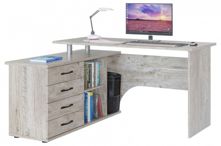 ручки выполнены из металлафункциональный — две рабочие поверхности, удобно держать все необходимое под рукой вместительный — оборудован тумбой с 4 ящиками, 2 просторными полками и нишей под системный блок угловая конструкция — экономит пространство, есть возможность выбора нужной ориентации стола (левый или правый угол) подходит для зонирования — задняя стенка выполнена из ЛДСП в цвете корпуса, можно ставить не у стены.