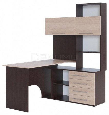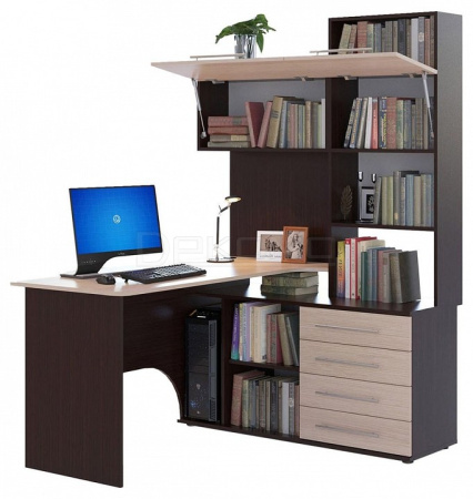Многофункциональный компьютерный стол КСТ-14 для домашнего кабинета или офиса. Модель сочетает в себе широкий компьютерный стол с размером столешницы 1400 мм, тумбу с ящиками, полками и нишей под системный блок. Высокая надстройка имеет открытые полки и два закрытых шкафа. Двери шкафчиков открываются вверх. Внутренний размер ящиков — 456 х 346 мм.