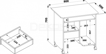 Размер полки под принтер составляет 278 х 396 мм. Высота полки под принтер составляет 278 мм. Под ней находится выдвижной ящик на роликовых направляющих. Под столешницей располагается полочка под клавиатуру.