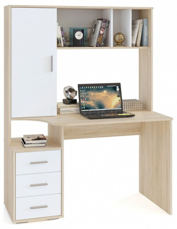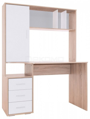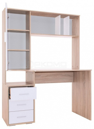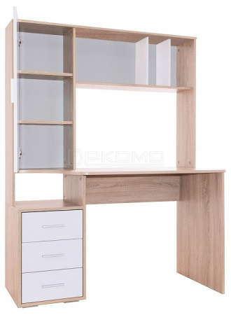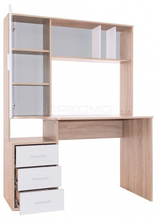В конструкции стола предусмотрена высокая надстройка с открытыми полками и закрытым стеллажом с двумя просторными полками, благодаря которым все нужные бумаги, книги и канцелярские принадлежности всегда будут под рукой. Под столешницей расположена тумба с открытой нишей и тремя выдвижными ящиками на шариковых направляющих.