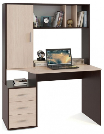 В конструкции стола предусмотрена высокая надстройка с открытыми полками и закрытым стеллажом с двумя просторными полками, благодаря которым все нужные бумаги, книги и канцелярские принадлежности всегда будут под рукой. Под столешницей расположена тумба с открытой нишей и тремя выдвижными ящиками на шариковых направляющих.