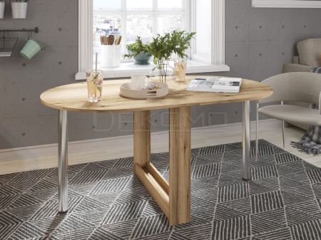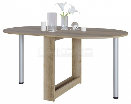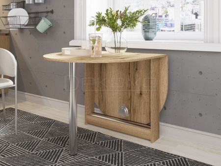 Небольшой овальный стол-книжка с откидной столешницей. Модель будет удобным элементом на небольшой кухне в квартире или в дачном домике. Отсутствие углов у столешницы снижает травмоопасность. При необходимости размеры столешницы можно увеличить, подняв крыло и прикрутив к нему ножку. В сложенном состоянии ножка хранится в специальной нише в основании стола.