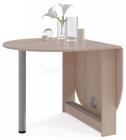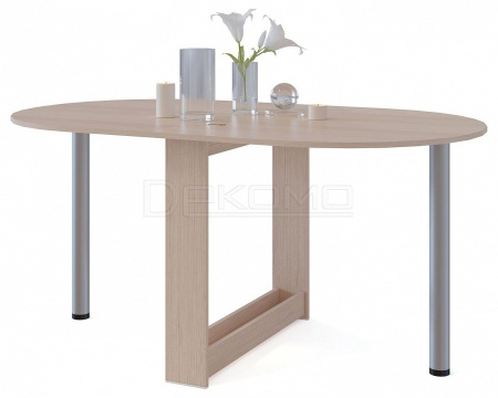 Небольшой овальный стол-книжка с откидной столешницей. Модель будет удобным элементом на небольшой кухне в квартире или в дачном домике. Отсутствие углов у столешницы снижает травмоопасность. При необходимости размеры столешницы можно увеличить, подняв крыло и прикрутив к нему ножку. В сложенном состоянии ножка хранится в специальной нише в основании стола.
