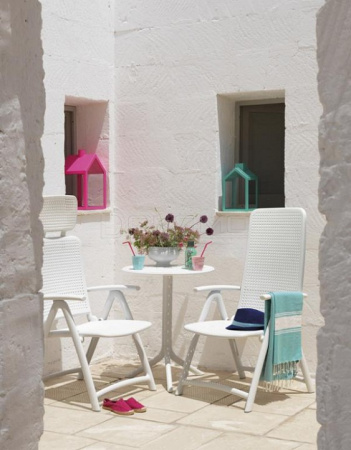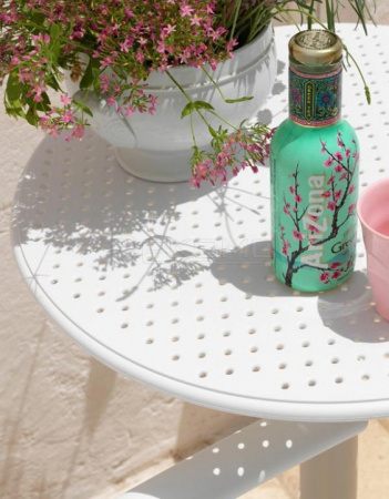 Стол Step из стекловолокна с круглой столешницей с небольшими декоративными перфорациями, которые также эффективно выполняют функцию дренажа. Вы легко можете сделать его как обеденным столом с высотой 765 мм, так и кофейным столиком высотой 400 мм.