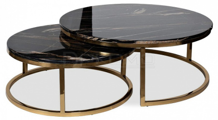 Комплект журнальных столов для гостиной – удачный выбор для гостиной, кабинета или спальной. Эти круглые журнальные столы немного различаются размерами. В результате один из них удобно задвигается под другой, экономя пространство. При необходимости столики можно раздвинуть, если у вас намечаются гости. Такой набор журнальных столов выглядит необычайно стильно и презентабельно. Мебель выполнена со вкусом, отвечает современным требованиям качества. Оригинальная опора из полированной нержавеющей стали золотого цвета эффектно сочетается со столешницей из черного искусственного мрамора с цветными прожилками.