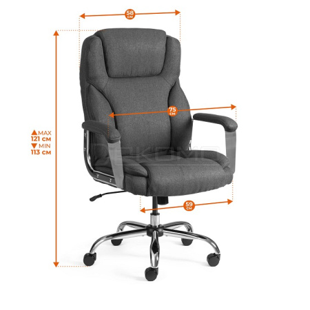 Кресло Appolon стильное кресло для руководителя. Кресла предназначено для домашнего кабинета или стильного кабинет в офисе, с повышенной нагрузкой до 180 кг, с комфортной посадкой за счет использования пружинных блоков в сиденье. Рассмотрим его ключевые характеристики: 1. Основная конструкция: Основание кресла выполнено из 5-лучевой стальной крестовины с хромированным покрытием, крестовина разборная. Диаметр крестовины составляет 700 мм, что обеспечивает устойчивость и надежность кресла. Крестовина прошла тест BIFMA, то есть выдерживает на испытаниях статическую нагрузку 1136 кг. 2. Ролики: Кресло оснащено полиуретановыми (прорезиненными) роликами увеличенного размера (диаметр 60 мм), которые подходят для использования на паркетных и ламинированных полах. Шток роликов имеет диаметр 11 мм и соответствует тесту BIFMA (не менее 100 000 циклов при испытаниях). 3. Газовый лифт: Газовый лифт 4 класса (наивысший) позволяет регулировать высоту кресла на 80 мм, что обеспечивает комфортную настройку под большой диапазон ростов пользователей. 4. Механизм качания: усиленный механизм с толщиной стали 3 мм (+20% стандартной толщины стали обычного качественного механизма). Он позволяет изменять высоту сидения и угол наклона до 15 градусов с возможностью фиксации в одном рабочем положении. Кроме того, предусмотрена регулировка жесткости качания с помощью винта под передней частью сиденья. 5. Подлокотники: Фиксированные стальные подлокотники с хромированным покрытием и мягкими накладками обеспечивают дополнительный комфорт. В местах сварки использована покраска под серебро. 6. Наполнение и каркас: Сиденье и спинка выполнены из новой (первичной) фанеры толщиной 15 мм, класса эмиссии Е1, с дополнительным пружинным блоком для удобства. Поролон плотностью 30 кг/мобеспечивает долговечную эксплуатацию. 7. Обивка: Обивка выполнена из ткани рогожка с износостойкостью не менее 20,000 циклов по тесту Мартинедейла, что свидетельствует о долговечности материала. 8. Вес: Вес кресла составляет 21,8 кг (нетто) и 24,8 кг (брутто). Обычное кресло как правило весит 15 кг, в данном случае увеличенный вес кресла говорит о повышенной материалоемкости и подтверждает способность кресла выдерживать значительные нагрузки. 9. Подголовник: Интегрированный в спинку подголовник нерегулируемого типа обеспечивает дополнительную поддержку спины при использовании. 10. Нагрузка: Кресло предназначено для пользователей весом до 180 кг, конструктив кресла и качество используемых материалов делает его подходящим для большинства пользователей. Данные характеристики делают кресло Appolon отличным выбором для пользователей, ищущих качественное кресло с повышенной нагрузкой для длительного офисного или домашнего использования, обеспечивая как комфорт, так и стиль.