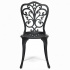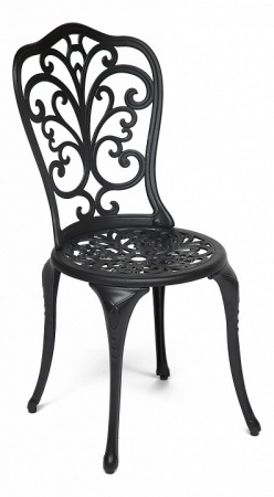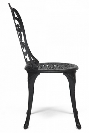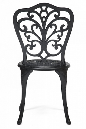 Стул Моцарт изготовлен из литого алюминия. Эта модель декорирована крупным ажурным орнаментом и выполнена в классическом черном цвете. К ней подойдут декоративные подушки Симфония эффектного красного цвета. Комплект из четырех или шести стульев Моцарт прекрасно сочетается с круглым столом Сальери.