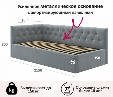 Укомплектована основанием - ортопедическими ламели на металлической рамке. Анатомические латы работают независимо, подстраиваясь под изгибы тела._x000D_ Срок службы механизма – 10 лет._x000D_ Рекомендуемый вес матраса - не более 18 кг._x000D_