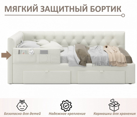 Кровать-тахта Afelia (Афелия) 900 с двумя мягкими спинками выполнена из модной мебельной ткани – велюр. Это уникальный материал, который получается за счет сплетения пяти волокон одновременно. Ткань износостойкая, легко чиститься от загрязнений, практичная, эластичная, устойчивая к ультрафиолету.