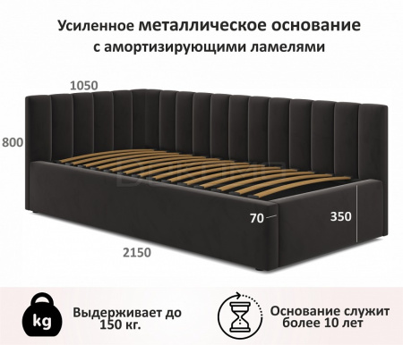 Мягкая односпальная кровать-тахта Milena 900 (Милена) с подъемным механизмом и двумя мягкими спинками выполнена из модной мебельной ткани – велюр. Это уникальный материал, который получается за счет сплетения пяти волокон одновременно. Дорогая ткань велюр придает кровати более величественный благородный вид. Ткань износостойкая, легко чиститься.