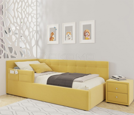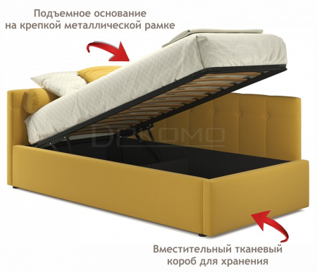 Мягкая односпальная кровать-тахта Bonna 900 (Бонна) с подъемным механизмом и двумя мягкими спинками выполнена из модной мебельной ткани – велюр. Это уникальный материал, который получается за счет сплетения пяти волокон одновременно. Дорогая ткань велюр придает кровати более величественный благородный вид. Ткань износостойкая, легко чиститься.