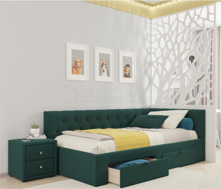 Угловая кровать-тахта Afelia (Афелия) 900 с двумя мягкими спинками выполнена из модной мебельной ткани – велюр. Это уникальный материал, который получается за счет сплетения пяти волокон одновременно. Ткань износостойкая, легко чиститься от загрязнений, практичная, эластичная, устойчивая к ультрафиолету.