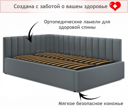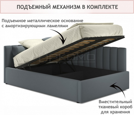 Подъемный механизм с гнутоклееными ортопедическими основаниями поднимает кровать под углом 45 градусов. Газлифты повышенной мощности позволяют поднимать и опускать ортопедическую рамку с матрасом без всяких усилий. Подкроватное пространство закрыто противопыльным матерчатым коробом из плотного спанбонда. Матерчатый короб фиксируется в подматрасном пространстве с помощью системы ленты-липучки "HOOK&LOОP" и служит ящиком для постельного белья и прочих принадлежностей. Высокие стенки обшиты сзади спанбондом.