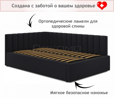 Мягкая кровать c подъемным ортопедическим основанием – уникальный предмет мебели, который совмещает в себе полноценную кровать и диван. Тахта с двумя мягкими спинками выполнена из модной мебельной ткани – велюр. Ткань износостойкая, легко чистится от загрязнений (влажной тряпочкой, любыми средствами, кроме средств с растворителями), практичная, эластичная, устойчивая к ультрафиолету.