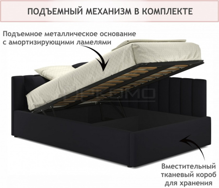 Подъемный механизм с гнутоклееными ортопедическими основаниями поднимает кровать под углом 45 градусов. Газлифты повышенной мощности позволяют поднимать и опускать ортопедическую рамку с матрасом без всяких усилий. Подкроватное пространство закрыто противопыльным матерчатым коробом из плотного спанбонда. Матерчатый короб фиксируется в подматрасном пространстве с помощью системы ленты-липучки "HOOK&LOОP" и служит ящиком для постельного белья и прочих принадлежностей. Высокие стенки обшиты сзади спанбондом.