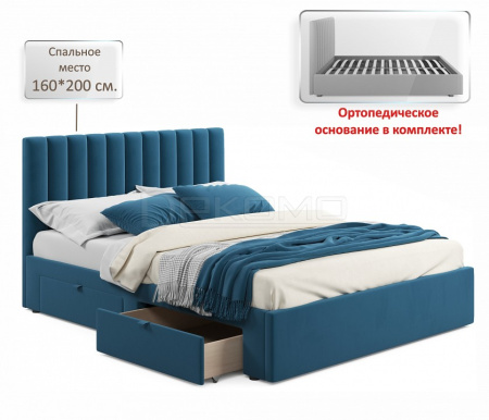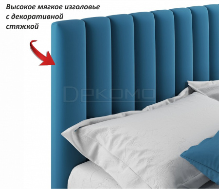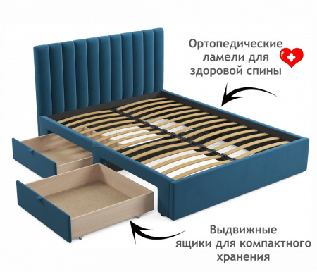 Мягкая двуспальная кровать с ортопедическим основанием и двумя выкатными ящиками – стильный и современный предмет мебели. Изюминкой двуспальной кровати из ткани является мягкое изголовье в виде объемных прямоугольных “батонов”. Обивка изголовья и весь периметр мягкой 2-спальной кровати выполнен из высокопрочного мебельного материала – велюр. Ткань износостойкая, легко чистится от загрязнений, практичная, эластичная, устойчивая к ультрафиолету. Задняя стенка обшита спанбондом.