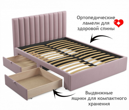 Кровать укомплектована двумя выкатными ящиками полного выдвижения на роликовых опорах. Ящики размещаются с одной любой из сторон кровати. Выкатные ящики облегчают уборку подкроватного пространства, позволяют разместить аккуратно вещи не первой необходимости.