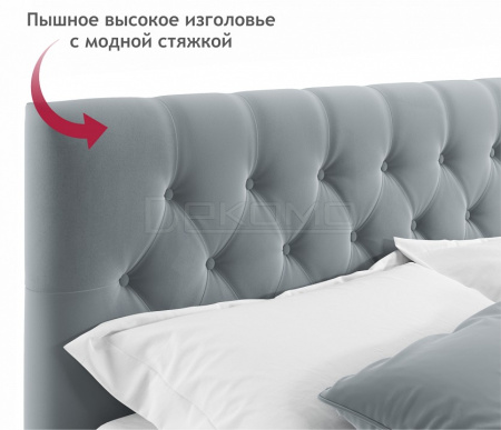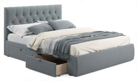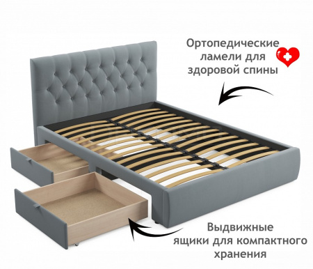 Мягкая двуспальная кровать с ортопедическим основанием и двумя выкатными ящиками – стильный и современный предмет мебели. Изюминкой кровати является мягкое изголовье с декоративными стяжками. Обивка изголовья и весь периметр кровати выполнен из высокопрочного мебельного материала – велюр. Ткань износостойкая, легко чистится от загрязнений, практичная, эластичная, устойчивая к ультрафиолету. Задняя стенка обшита спанбондом.