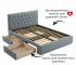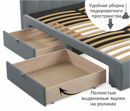 Кровать укомплектована двумя выкатными ящиками полного выдвижения на роликовых опорах. Ящики размещаются с одной любой из сторон кровати. Выкатные ящики облегчают уборку подкроватного пространства, позволяют разместить аккуратно вещи не первой необходимости.