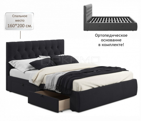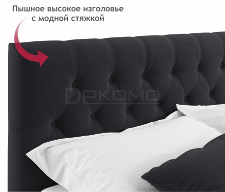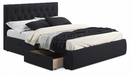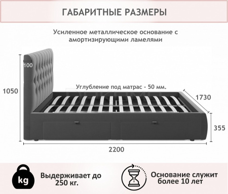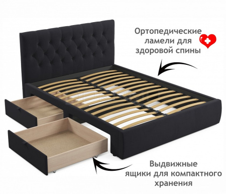 Мягкая двуспальная кровать с ортопедическим основанием и двумя выкатными ящиками – стильный и современный предмет мебели. Изюминкой кровати является мягкое изголовье с декоративными стяжками. Обивка изголовья и весь периметр кровати выполнен из высокопрочного мебельного материала – велюр. Ткань износостойкая, легко чистится от загрязнений, практичная, эластичная, устойчивая к ультрафиолету. Задняя стенка обшита спанбондом.