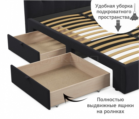 Кровать укомплектована двумя выкатными ящиками полного выдвижения на роликовых опорах. Ящики размещаются с одной любой из сторон кровати. Выкатные ящики облегчают уборку подкроватного пространства, позволяют разместить аккуратно вещи не первой необходимости.