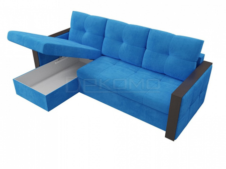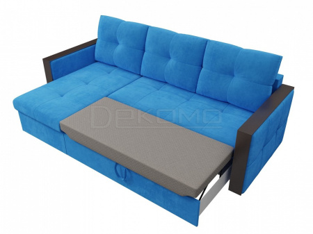 Спальный угловой диван Валенсия – отражение изысканной испанской классики. В нем оригинально сочетаются натуральные ткани и дерево. Спинка образуется за счет трех объемных подушек. Угол можно разместить справа или слева, по желанию будущего владельца. Подлокотники – это удобные столики с идеально ровной поверхностью. Диван дополнен вместительным ящиком для белья.