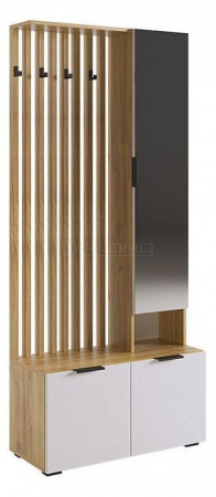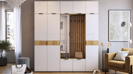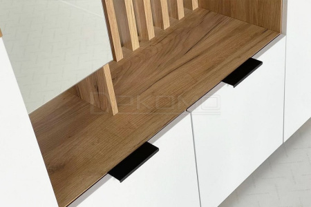 Прихожая Бери — это сочетание функциональности и современного дизайна для вашей входной зоны. В ней продумано все до мелочей: удобные полки для одежды, тумба для обуви, а также открытая зона с крючками для верхней одежды и нишей для головных уборов. Особое внимание заслуживают вставки на фасадах с вертикальной фрезеровкой, которые делают дизайн мебели по-настоящему уникальным. А зеркальное полотно позволит вам быстро и легко оценить свой образ перед выходом на улицу.