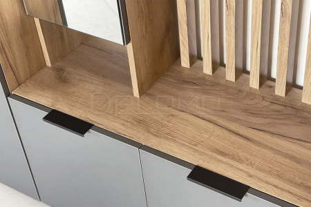 Прихожая Бери — это сочетание функциональности и современного дизайна для вашей входной зоны. В ней продумано все до мелочей: удобные полки для одежды, тумба для обуви, а также открытая зона с крючками для верхней одежды и нишей для головных уборов. Особое внимание заслуживают вставки на фасадах с вертикальной фрезеровкой, которые делают дизайн мебели по-настоящему уникальным. А зеркальное полотно позволит вам быстро и легко оценить свой образ перед выходом на улицу.