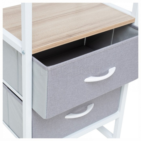 Экологичные ручки и прочные ящики из спанбонда и льна с водоотталкивающим покрытием делают вешалку долговечной и легкой в уходе. Регулируемые ножки и крепление к стене обеспечивают безопасность, а два уровня полок увеличивают функциональность.