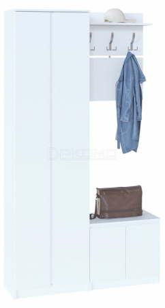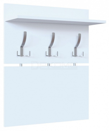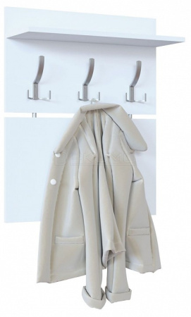 Компактная вешалка-полка позволяет разместить одежду всей семьи. Модель состоит из двух панелей, соединенных металлическими вставками. Верхняя полка предназначена для головных уборов и зонтов. Крючки выполнены из металла, что обеспечивает долговечность и надежность модели.