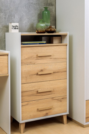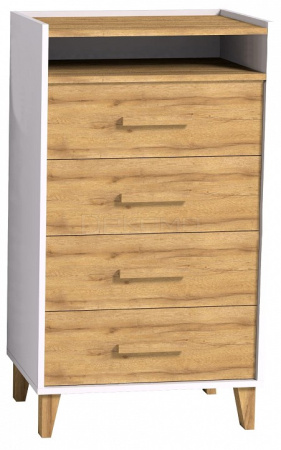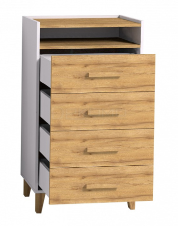 Особенности: безупречный скандинавский стиль, сочетание двух эко-декоров - белого и дуба золотистого, надежный материал ЛДСП (класс эмиссии Е1), кромка ПВХ 2 мм, бесшумные шариковые направляющие плавного выдвижения, ручки из массива, оптимальная высота опор, позволяющая роботу-пылесосу беспрепятственно заезжать под комод.