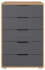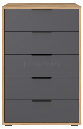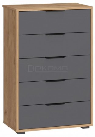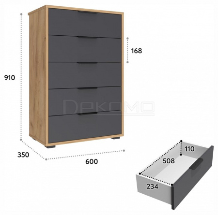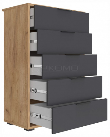 5 выдвижных ящиков – просторное и организованное хранение одежды, белья, аксессуаров и других мелочей. Телескопические направляющие полного выдвижения – плавный ход ящиков и легкий доступ к содержимому. Свес крышки (25 мм) – позволяет комоду плотно прилегать к стене даже при наличии плинтуса. Регулируемые опоры (20 мм) – компенсируют неровности пола для устойчивости.Металлические ручки – прочные и стильные, дополняют дизайн.