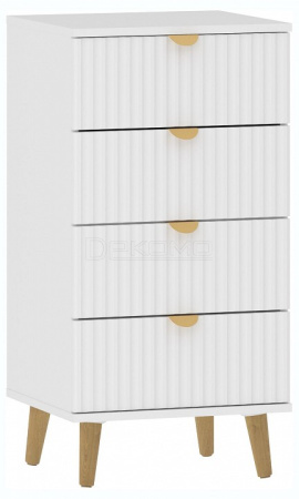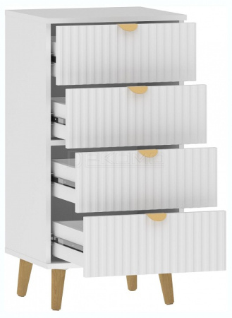 Комод Дакота НМ 040.17 с лаконичным дизайном. Трендовая рельефная фрезеровка на фасадах волна. Металлические ручки, цвет-золото. Каркас: ЛДСП 16 мм. Фасад: МДФ 16 мм. Опоры деревянные, бук. Четыре выдвижных ящика.