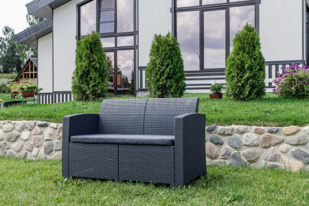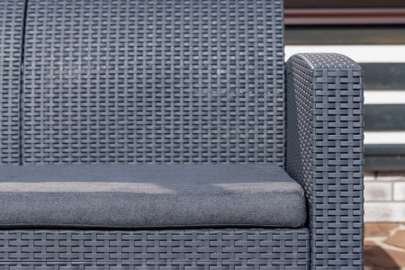 Диван выполнен из окрашенного в массе полипропилена с повышенной прочностью, что обеспечивает ему долговечность и устойчивость к неблагоприятным погодным условиям. Этот материал не только демонстрирует высокие эксплуатационные характеристики, но и легко очищается от загрязнений.