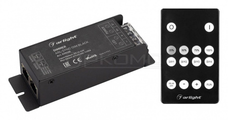 1-канальный диммер с радиопультом 14 кнопок. Питание 12-24VDC, макс.ток 1х25A, максимальная мощность 300-600W. Габариты диммера 127x42x32 мм, габариты пульта 85х51х6 мм. Синхронизация между несколькими контроллерами при подключении сетевым кабелем через разъем RJ45 (расстояние до 80 метров).