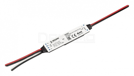Миниатюрный диммер для монохромной светодиодной ленты (ШИМ). Питание/рабочее напряжение 12-24VDC, максимальный ток 3A на канал, 1 канал, максимальная мощность 36-72W, плавный старт (smooth start), функция Push-Dim. Габариты 60x14x6 мм. Управляется пультами и панелями серии SMART (поставляются отдельно).
