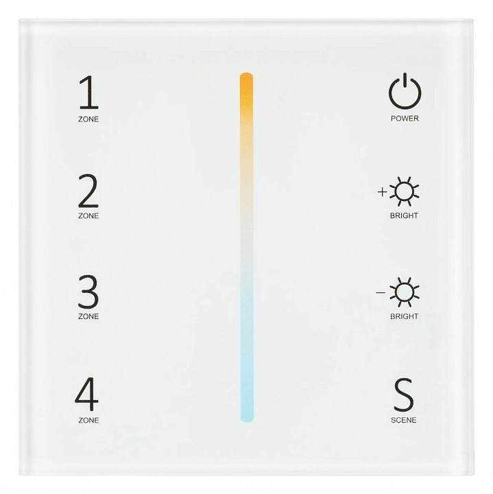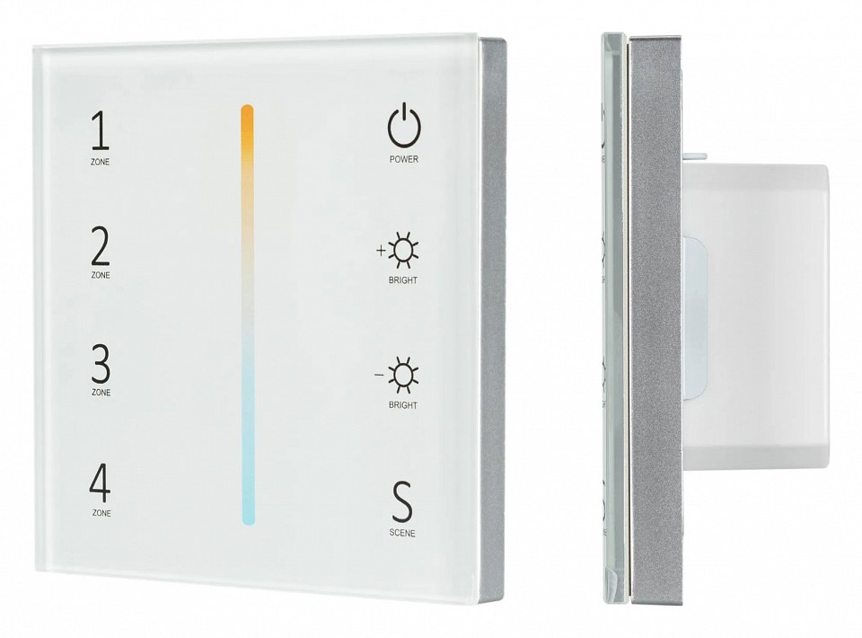 Встраиваемая сенсорная стеклянная панель 2.4 ГГц, цвет белый. Для управления температурой свечения (MIX/CCT) и яркостью с помощью сенсорной полосы. Питание/рабочее напряжение AC 85-265V, 4 зоны управления, память 4 сцен. Функция управления DMX512 устройствами. Габариты 86х86х36 мм. Панель совместима с контроллерами и пультами серии SMART.