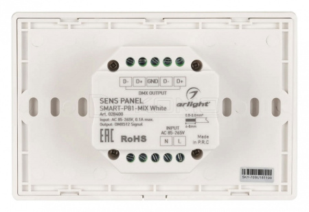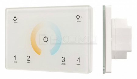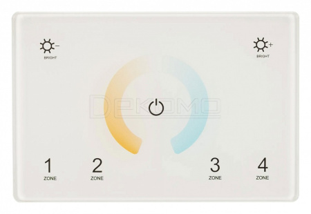 Встраиваемая сенсорная панель 2.4 ГГц, цвет белый. Итальянский стандарт. Материал - стекло. Для управления мультибелыми (MIX/CCT) источниками света (ШИМ), 4 зоны управления. Функция управления DMX512 устройствами. Питание/рабочее напряжение AC 85-265V. Габариты 120х80х37 мм, устанавливается в стандартный подрозетник. Панель совместима с контроллерами серии SMART.