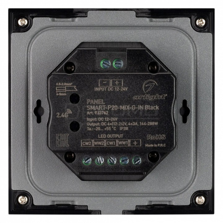 Встраиваемая роторная стеклянная панель 2.4 ГГц, цвет чёрный. Для управления MIX (CCT) источниками света (ШИМ). Управление цветовой температурой с помощью роторного вращателя. Работает в режиме master/slave и может выполнять функцию независимого контроллера. Питание/рабочее напряжение 12-24VDC, 2 пары параллельных каналов по 3А максимальной нагрузки на канал, максимальная суммарная мощность 144-288W. Габариты 86х86х50 мм. Панель совместима с контроллерами и пультами серии SMART.
