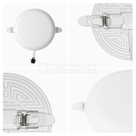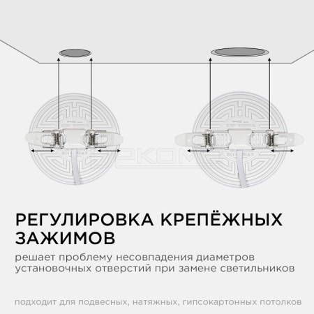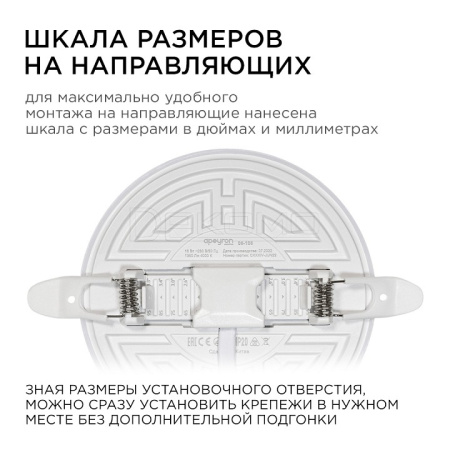 Особенностью данного изделия является 3-х ступенчатая регулировка уровня освещенности путем нажатия клавиши выключателя:освещение всей поверхности плафона, угол рассеивания 180° концентрированное освещение внутреннего диаметра, угол рассеивания 120° засветка торцевой части панели, эффект "кольцевого освещения". Вторая особенность панели – регулировка крепежных зажимов под посадочное отверстие Ø55-105 мм.