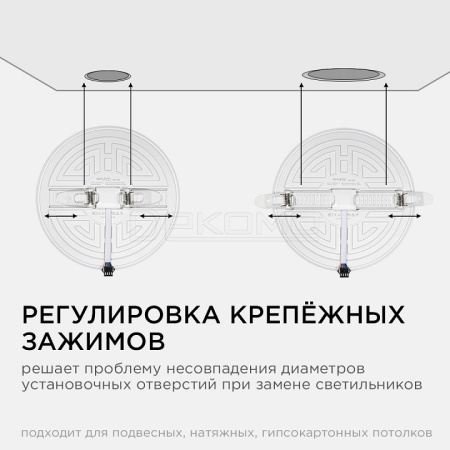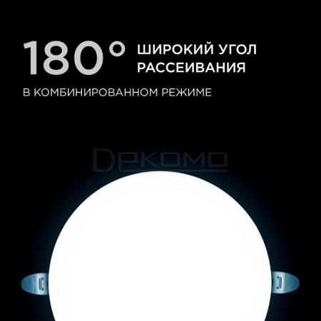 Особенностью данного изделия является 3-х ступенчатая регулировка уровня освещенности путем нажатия клавиши выключателя:освещение всей поверхности плафона, угол рассеивания 180° концентрированное освещение внутреннего диаметра, угол рассеивания 120° засветка торцевой части панели, эффект "кольцевого освещения". Вторая особенность панели – регулировка крепежных зажимов под посадочное отверстие Ø55-155 мм.