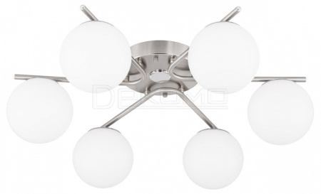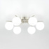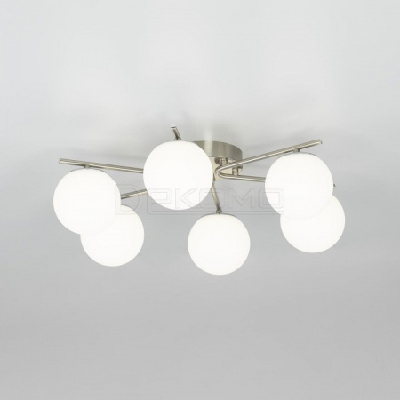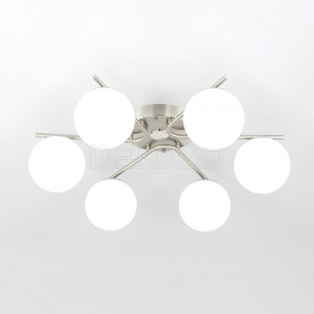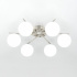 Люстра шестирожковая с круглым основанием, корпус металлический, цвет матовый хром. Плафоны в форме шара, изготовлены из оптического полимера, цвет белый матовый. В основании каждого плафона расположен уникальный светодиодный модуль, обеспечивающий яркое основное освещение или красочную RGB подсветку, с плавной регулировкой яркости во всех режимах света.