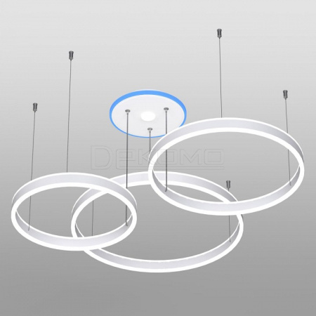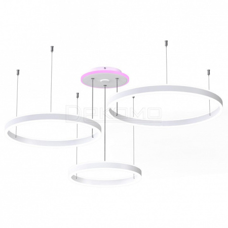 светильником можно управлять: из приложения на смартфоне по Wi-Fi при наличии интернета, с помощью голосовых помощников Алиса и Маруся, а также пультом дистанционного управления и настенным выключателем, светильник на тросах, с тремя светодиодными модулями в форме колец. Конструкция изделия позволяет при монтаже установить кольца на разной высоте и на разном удалении от базы, сформировав свой индивидуальный, неповторимый внешний вид светильника