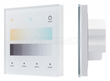 встраиваемая стеклянная сенсорная панель DIM с выходом DALIуправление DALI 1 адрес / DALI группа / DALI Broadcast установка адресов управления выполняется переключателями на корпусе сохранение 4-х пользовательских сценариев доступно управление с помощью пультов RF 2.4GHz серии SMART