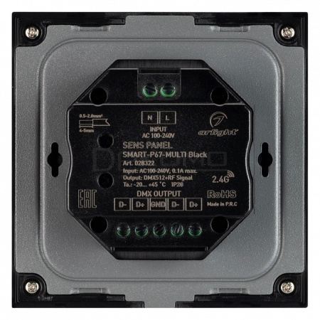Встраиваемая сенсорная панель 2.4 ГГц, цвет чёрный. Материал - стекло. Для управления RGB+MIX (5-канальными) источниками света (ШИМ), 4 зоны управления. Питание/рабочее напряжение AC 85-265V. Функция управления DMX512 устройствами. Габариты 86х86х35 мм. Панель совместима с контроллерами серии SMART.