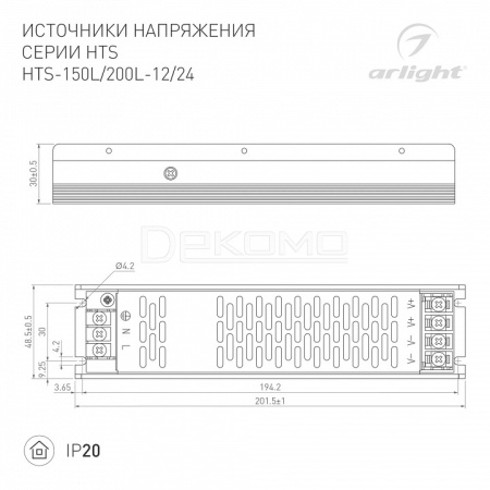 Источник напряжения с гальванической развязкой для светодиодных изделий. Входное напряжение 176-264 VAC. Выходные параметры: 12 В, 12.5 А, 150 Вт. Встроенный PFC >0,5. Негерметичный алюминиевый сетчатый корпус IP 20. Габаритные размеры длина 202 мм, ширина 49 мм, высота 30 мм. Подстройка выходного напряжения. Гарантийный срок 3 года.