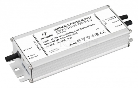 Диммируемый источник напряжения по стандарту 0-10 В с гальванической развязкой для светодиодных изделий. Входное напряжение 120-240 VAC. Выходные параметры: 12 В, 8.3 А, 100 Вт. Встроенный PFC >0,9. Негерметичный алюминиевый корпус IP 20. Габаритные размеры длина 188 мм, ширина 67.5 мм, высота 33.5 мм. Гарантийный срок 7 лет.